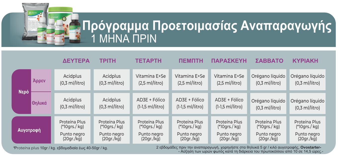 ΠΡΟΓΡΑΜΜΑΤΑ ΠΡΟΕΤΟΙΜΑΣΙΑΣ ΑΝΑΠΑΡΑΓΩΓΗΣ Μετά την επιστροφή των πτηνών απο τους διαγωνισμούς πρέπει να αρχίσει να προγραμματίζεται η προετοιμασία της αναπαραγωγής καναρινιών, καρδερινών και άλλων πτηνών. Με την Avianvet το κάνουμε εύκολο απλώς ακολουθώντας τα προγράμματα που έχουμε ετοιμάσει. Τα προγράμματα Avianvet αποτελούνται από προετοιμασία αρσενικών και θηλυκών για 1 μήνα πριν από το ζευγάρωμα. Ο εκτροφέας πρέπει να καθοδηγείται μόνο από τις Στην Avianvet, έχουμε 2 διαφορετικά πρωτόκολλα. Αφενός ένα πρωτόκολλο «sin doré» για μωσαϊκά καναρίνια και λιποχρωμικά και από την άλλη ένα πλήρες πρόγραμμα για όλα τα Τα προγράμματα Avianvet έχουν χρησιμοποιηθεί εδώ και αρκετά χρόνια από εκατοντάδες εκτροφείς με θαυμάσια αποτελέσματα στην προετοιμασία για |