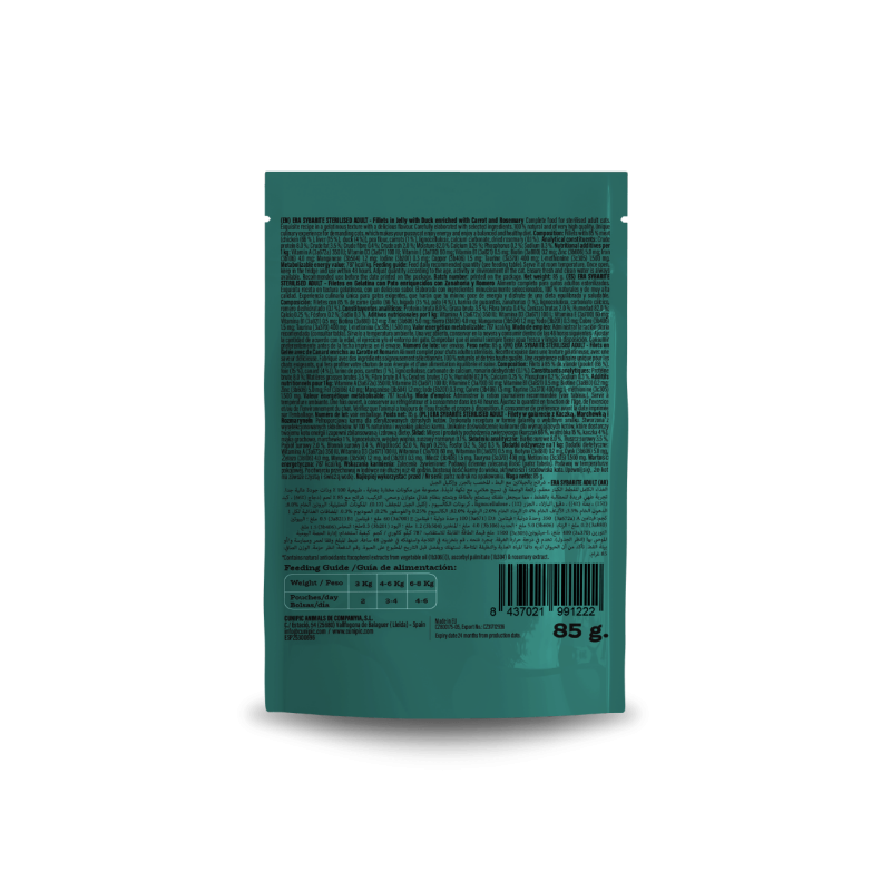 Η υγρή τροφή ERA Sybarite Sterilized Adult Duck με καρότο και δεντρολίβανο είναι μια πλήρης τροφή για στειρωμένες ενήλικες γάτες όλων των φυλών, φτιαγμένη με 85% φρέσκο κρέας, η οποία προσφέρει εξαιρετική γευστικότητα και υψηλή βιολογική αξία. Αυτό το προϊόν παρασκευάζεται με προσεκτικά επιλεγμένα συστατικά, 100% φυσικά και πολύ υψηλής ποιότητας. Επομένως, δημιουργείται μια μοναδική γαστρονομική εμπειρία που θα κάνει και τις πιο απαιτητικές γάτες να απολαύσει μια ισορροπημένη και υγιεινή διατροφή.